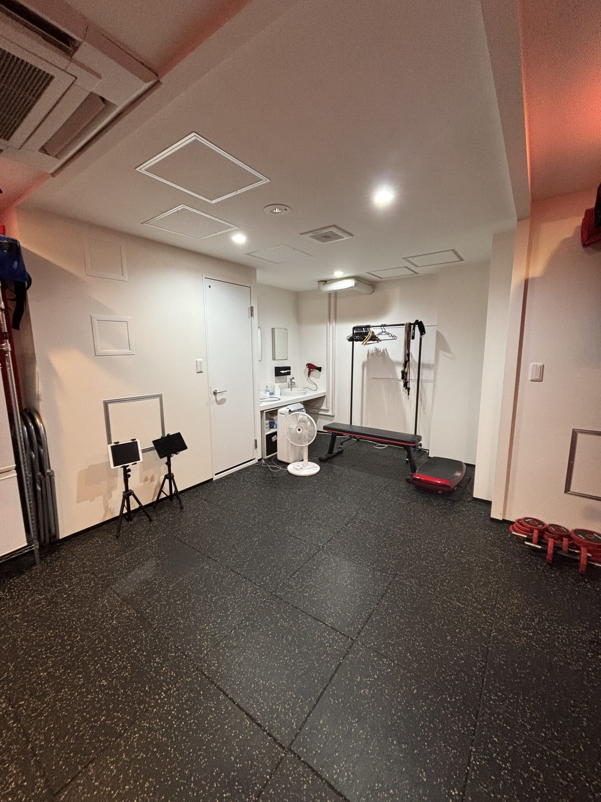 鏡張りの広い空間で思い切り体を動かす事が出来ます。専用のシューズがいらないので、靴下、はだしで運動できることも